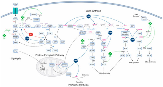 Involvement of transcriptional factors c-Myc, p53, and HIF1 in the regulation of glycolysis, pentose phosphate pathway (PPP), pyrimidine, and purine synthesis. p53 modulates PPP via PFK1 and G6PDH, and purine and pyrimidine synthesis through RNR and GMPS. C-Myc and HIF1 regulate PPP through transcription of G6PDH and TKT. In addition, c-Myc induces gene expression of PRPPS, PPAT, PFAS, PAICS, ATIC, ADSL, ADSS, IMPDH, NDPK, CTPS, CAD, DHOD, and TS. Abbreviations: acetyl- coenzyme A (Ac-CoA), adenylosuccinate lyase (ADSL), adenylosuccinate synthase (ADSS), adenosine diphosphate (ADP), adenosine-5′-monophosphate (AMP), adenosine triphosphate (ATP), aspartate (Asp), 5-aminoimidazole-4-Carboxamide Ribonucleotide Formyltransferase/IMP Cyclohydrolase (ATIC), ataxia-telangiectasia mutated (ATM), ataxia telangiectasia and Rad3 related (ATR), carbamoyl-phosphate synthetase 2, aspartate transcarbamoylase, dihydroorotase (CAD), cytidine biphosphate (CDP), cytidine triphosphate (CTP), cytidine triphosphate synthase (CTPS), cytidine/uridine monophosphate kinase (CMPK), deoxyadenosine triphosphate (dATP), deoxycytidine triphosphate (dCTP), deoxyguanosine triphosphate (dGTP), deoxythymidine monophosphate (dTMP), deoxythymidine triphosphate (dTTP), deoxyuridine monophosphate (dUMP), deoxyuridine diphosphate (dUDP), dihydroorotate dehydrogenase (DHOD), erythrose-4- phosphate (4EP), fructose-6-phosphate (F6P), fructose-1,6 biphosphate (F1,6BP), glicine (Gly), glucose (Glu), glucose-6-phosphate (G6P), glucose-6-phosphate dehydrogenase (G6PDH), glutathione (GSH), glutathione peroxidase (GPX), glutathione reductase (GRd), oxidized glutathione (GSSG), guanosine monophosphate synthetase (GMPS), guanosine diphosphate (GDP), guanosine triphosphate (GTP), guanosine monophosphate synthase (GMPS), glyceraldehyde-3-phosphate (GA3P), glycinamide ribonucleotide (GART), hexokinase (HX), inosine 5′-monophosphate dehydrogenase (IMPDH), inosine monophosphate (IMP), N-10-formyltetrahydrofolate (N10 formyl-THF), nicotinamide adenine dinucleotide (NAD), nicotinamide adenine dinucleotide phosphate (NADPH), nucleoside diphosphate kinase (NDPK), phosphofructokinase type 1 (PFK1), phosphoribosylformylglycinamide synthase (PFAS), 6-phosphogluconate (6PG), 6-phosphogluconolactona (6PGL), 6-phosphogluconolactonase (6PGLS), 6-phosphogluconate dehydrogenase (6PGDH), phosphoribosylaminoimidazole carboxylase (PAICS), phosphoribosylamine (PRA), phosphoribosylpyrophosphate amidotransferase (PPAT), phosphoribosylpyrophosphate (PRPP), phosphoribosylpyrophosphate synthetase (PRPPS), pyruvate (Pyr), ribonucleotide reductase (RNR), ribose- 5-phosphate (R5P), ribulose -5-phosphate (Rib5P), ribulose -5-phosphate epimerase (R5PE), ribulose -5-phosphate isomerase (R5PI), sedoheptulose- 6- phosphate (S6P), thymidylate synthase (TS), thymidylate monophosphate (TMP), uridine diphosphate (UDP), uridine monophosphate (UMP), uridine monophosphate synthetase (UMPS), xylose-5-phosphate (X5P), and xanthosine -5′-phosphate (XMP). ↑ activation, ⊥ inhibition. The figure was created with BioRender.com.