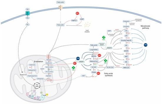 c-Myc binds to and activates SREBP1 to synergistically regulate FA synthesis, promoting tumorigenesis in vitro and in vivo (Figure 4). c-Myc induces lipogenesis by positively regulating the transcription of SREBP1, ATP citrate lyase (ACL), acetyl-CoA carboxylase A (ACCA), FASN, fatty acid elongases (ELOVL2 and ELOVL6), and stearoyl CoA desaturase (SCD1) []. In contrast, c-Myc downregulates the expression of genes involved in β-oxidation, including CPT1A, CPTIB []. c-Myc induces the synthesis of mRNA coding for genes involved in the synthesis of cholesterol and steroid hormones, such as FDFT1, squalene monooxygenase (SQLE), lanosterol synthase (LSS), CYP5IAI, NAD(P)H steroid dehydrogenase-like (NSDHL), 17-beta-hydroxysteroid dehydrogenase type 7 (HSD17B7), emopamil-binding protein (EBP), sterol-C5-desaturase/lathosterol oxidase (SC5DL), and sterol-∆7-reductase (DHCR7) [].