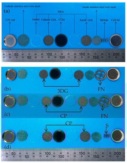 Photograph of the button-type micro direct methanol fuel cell(B-μDMFC) components: (a) the three-dimensional graphene–springs (3DG + S) B-μDMFC; (b) the 3D graphene–foam nickel (3DG + FN) B-μDMFC; (c) the carbon paper–foam nickel(CP + FN) B-μDMFC; and (d) the carbon paper–springs(CP + S) B-μDMFC. MEA, membrane electrode assembly; GDL, gas diffusion layer.