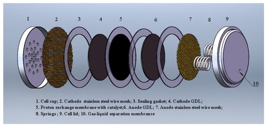 The components and structure of the button-type micro direct methanol fuel cell (B-μDMFC) are shown in Figure 1 and Figure 2, respectively. Similar to the conventional DMFC, the key component of the cell is a membrane electrode assembly (MEA), which comprised a proton exchange membrane, cathode and anode catalytic layer, and cathode and anode gas diffusion layer. The diameter of the active area of the MEA was 1.5 cm, and thus the area was 1.77 cm2. Carbon paper and three-dimensional graphene were adopted as the cathode and anode GDL, respectively. In order to reduce the internal contact resistance of the cell and support the GDL, a titanium-plated stainless steel wire mesh was added between the gas diffusion layer and the end plate on both sides of the anode and cathode. The lid and cup of standard lithium battery were used as the anode and the cathode end plate of the B-μDMFC.