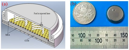(a) Cross-sectional view of the 3DG + S B-μDMFC; (b) the packaged B-μDMFC.