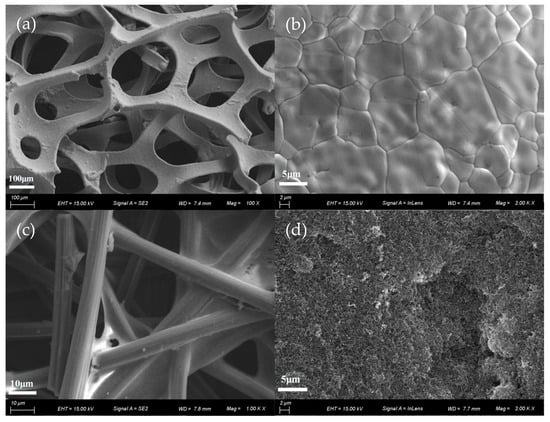 Figure 4a is a low-magnification scanning electron microscope (SEM) image of 3DG to show the 3DG interconnected network structure in order to provide a large specific surface area and high porosity. This structure provides a multi-channel pathway for methanol diffusion and CO2 removal. 3DG is also an excellent current collector owing to its high conductivity. Figure 4b is a high-magnification SEM image of 3DG to suggest that graphene was uniformly coated on a FN substrate. The graphene film was continuously grown based on chemical vapor deposition(CVD) []. In addition, because of the difference in thermal expansion between the FN and the grown graphene film, irregular wrinkles of the graphene surface can be seen in Figure 4b. Figure 4c,d are SEM images of carbon paper and micro-porous layers, respectively. As can be seen from the figure, the Teflon is uniformly covered on carbon fibers, so the water generated in the cell can be eliminated timely. The dense structure of the carbon fiber cross-section is beneficial for the improvement of electrical conductivity, but may cause a lower porosity for being not conducive to the transmission of liquid and gas.