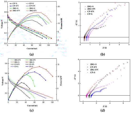 The B-μDMFCs were packaged in a packaging machine for lithium-ion button battery. Before assembly, the cells were tested in a press machine under a constant pressure of 1 MPa. Both of the tests of the B-μDMFC before and after packaging were carried out at room temperature and in passive mode. The methanol concentration used in this experiment was 1 mol L−1. As shown in Figure 6a, the peak powers of all four cells exceed 10 mW. The peak power of the CP + S button cell is 12 mW, which is the lowest of the four cells. The 3DG + FN cell has the highest peak power of 16.5 mW, which means that the cell discharge current can reach 82 mA when the voltage is rated at 0.2 V. Figure 6b shows the Nyquist curve of various structural button fuel cells before packaging. The 3DG + FN button fuel cells have a minimum ohm resistance of 0.4 Ω and the CP + S button fuel cells have a maximum ohm resistance of 0.8 Ω.