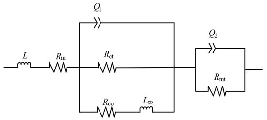 Considering the complex reaction processes of substances (methanol, oxygen, and water), mass transport and diffusion, and electron transfer during the operation of B-μDMFC, the μDMFC full cell equivalent circuit (Randles circuit) model [] was applied to understand the measured cell alternating current(AC) impedance. The measured Bode and Nyquist curves by electrochemical impedance spectroscopy(EIS) technology were fitted using the equivalent circuit model. As shown in Figure 7, Rm is the ohmic resistance of the cell, Rct is the charge transferresistance, Rmt is the mass transfer resistance, L is the pseudo-inductanceinduced by the outside circuits and test equipments, Q1 and Q2 express the charge and discharge process of the doublelayer capacity of the anode and cathode, and resistance of RCO and lowfrequency impedance of LCO express the relaxation process of the CO product in the anode electrode.