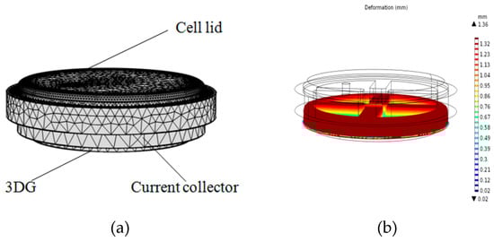 The support current collector (FN) and the gas diffusion layer (CP and 3DG) in the cell are porous materials and will be greatly deformed under compression pressure. Large deformation often causes lower porosity of porous materials, which has a great influence on the cell performance. The support current collector FN used herein has a thickness of 4 mm and the thickness of 3DG is 0.5 mm. The geometric model (shown in Figure 8) consists of the cell lid, anode support current collector, and anode gas diffusion layer (3DG). A uniform pressure of 1 MPa is applied to the cell lid, and the bottom of the GDL is fixed.