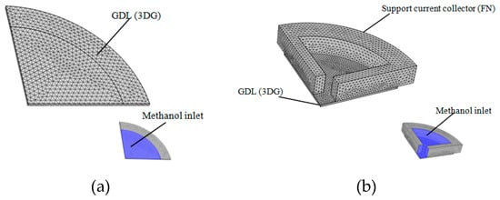 (a) The methanol concentration diffusion model of the 3DG + S cell; (b) three-dimensional methanol concentration diffusion model of the FN + 3DG cell.