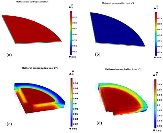 (a) Front view of methanol concentration distributions in the gas diffusion layer (GDL) of the 3DG + S structural cell; (b) back view of methanol concentration distributions in GDL of the 3DG + S structural cell; (c) front view of methanol concentration distributions in the 3DG + FN structural cell; (d) back view of methanol concentration distributions in the 3DG + FN structural cell.
