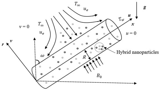 Consider the buoyancy effects on a magnetohydrodynamic SPF of a steady incompressible hybrid nanofluid past an inclined cylindrical surface, as shown in Figure 1. The coordinates are measured in the corresponding axial and radial directions of the cylinder. It is assumed that the temperature of the cylindrical surface, , is higher than the surrounding temperature, . In the current study, the thermophysical properties of the hybrid nanofluid are taken to be uniform. Meanwhile, copper nanoparticles are combined with the base fluid to produce Cu/H2O nanofluid, which is then combined with the alumina nanoparticles, Al2O3, to create the required hybrid nanofluid, Al2O3-Cu/H2O.