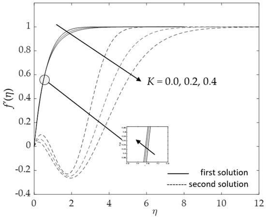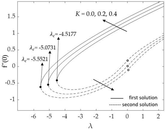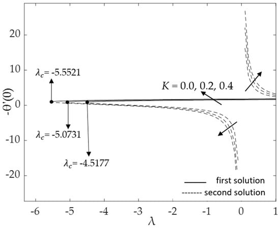 Table 5 presents the smallest eigenvalues, γ, of the Al2O3–Cu/H2O hybrid nanofluid for several values of K when M = 0.1, Pr = 6.2, ω = 30° and ϕ1 = ϕ2 = 0.01. The obtained minimum eigenvalues are positive for the first solution, but negative for the second solution. Referring to Equation (19), positive values of γ indicate a decay of disturbance as time evolves . On the other hand, negative values of γ show an initial growth in disturbance, and thus the solutions obtained for this case are unstable in the long run. Moreover, for both solutions, the smallest eigenvalue γ approaches zero as λ approaches the bifurcation value λc. This means that, at turning points (from the first to the second solution), there is a change in the values of λ from stable (positive) to unstable (negative). Thus, this finding supports the stability and physical reliability of the first branch solutions. As shown by the temporal stability analysis, the second solution is unstable in the long run. Although such solutions may lack physical significance (in the long run), they are still of mathematical interest as far as the differential equations are concerned. The second solution is also a solution to the differential equations. Similar equations may arise in other situations where the corresponding solution can have a more realistic meaning.