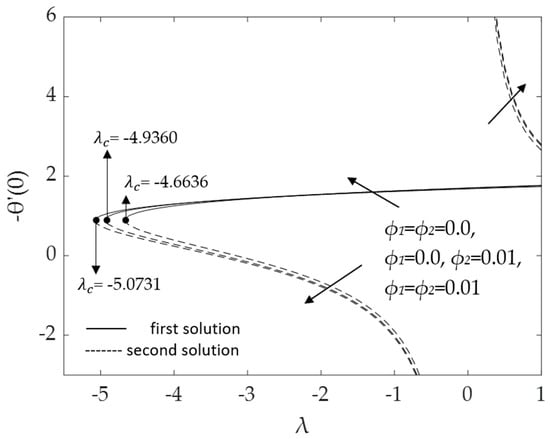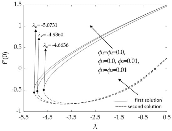 Figure 4 and Figure 5 demonstrate the influences of the hybrid nanoparticle volume fractions ϕ1, ϕ2 on the skin friction and heat transfer rate, respectively, when M = 0.1, Pr = 6.2, ω = 300 and K = 0.2. It was discovered that the bifurcation value λc for water (ϕ1 = ϕ2 = 0.0) was −4.6636; for Cu/H2O nanofluid (ϕ1 = 0.0, ϕ2 = 0.01) it was −4.9360; and for Al2O3-Cu/H2O hybrid nanofluid (ϕ1 = ϕ2 = 0.01), it was −5.0731. It was realized that the bifurcation values λc (in the opposing region) and the values of increase when the hybrid nanoparticle volume fractions increase. The results prove that the augmentation of the hybrid nanoparticle volume fraction improves fluid viscosity and thus enhances skin friction, leading to an increase in drag forces. Figure 5 illustrates the same dual solutions pattern as Figure 3. As the nanoparticle volume fractions ϕ1, ϕ2 increase, the heat transfer rate for the first solution also increases, which implies that the Al2O3-Cu/H2O hybrid nanofluid transfers heat more efficiently than the Cu/H2O nanofluid and pure base fluid. However, for the second solution, the heat transfer rate decreases for the opposing flow but rises for the assisting flow. It is worth noting that a hybrid nanofluid can have a higher heat transfer rate than a regular nanofluid as well as a pure fluid, as has been proved experimentally and numerically by numerous researchers, see for example [,].