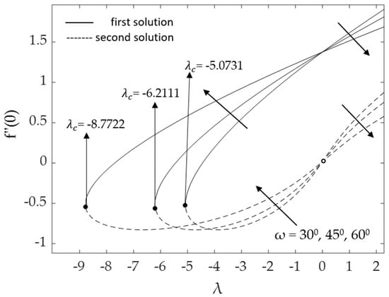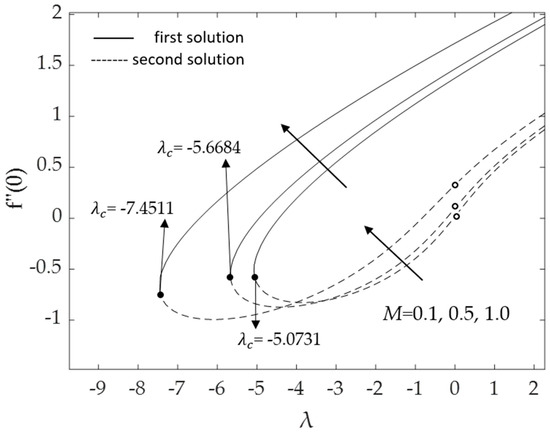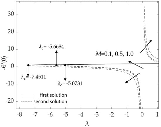 Moreover, Figure 6 and Figure 7 display the changes in the values of the skin friction coefficient and the heat transfer rate of the dual solutions for the numerous values of an inclination angle ω when Pr = 6.2, M = 0.1, ϕ1 = ϕ2 = 0.01 and K = 0.2, respectively. The value of for opposing flow (λ < 0) increases as the inclination angle rises. Physically, as the value of ω increases relative to the posited x-axis and when the curvature parameter is present, the effect of buoyancy force due to gravity decreases, causing to increase but to decline. The critical values λc = −5.0731, −6.2111, and −8.7722 for ω = 30°, 45°, and 60°, respectively, are shown in this illustration as well. The larger values of inclination angle augment the drag force, thus lowering the velocity within the boundary layer. The reason for this is the decreasing effect of gravity (see Rehman et al. []). Figure 7 illustrates how the increasing value of the inclination angle reduces the rate of heat transmission. As the temperature rises, the rate of heat transmission decreases. The influences of the drag force and heat transfer rate against λ for some values of magnetic parameter M when ω = 30°, Pr = 6.2, K = 0.2 and ϕ1 = ϕ2 = 0.01 are demonstrated in Figure 8 and Figure 9. Because of the Lorentz force, the velocity and temperature gradients escalate with rising values of the magnetic parameter. This force is generated by the presence of a magnetic field in the fluid flow, which forms resistance to the movement of the fluid. As a result, the skin friction increases, raising the velocity gradient and the temperature gradient , which are proportional to the skin friction and the heat transfer rate, respectively (see Equation (12)). In addition, in the presence of a magnetic field (M > 0), the heat transfer rate is enhanced as the inclination angle increases. This is because the magnetic force counteracts the gravitational buoyancy force at <90° but no longer counteracts it at ω = 90°.
