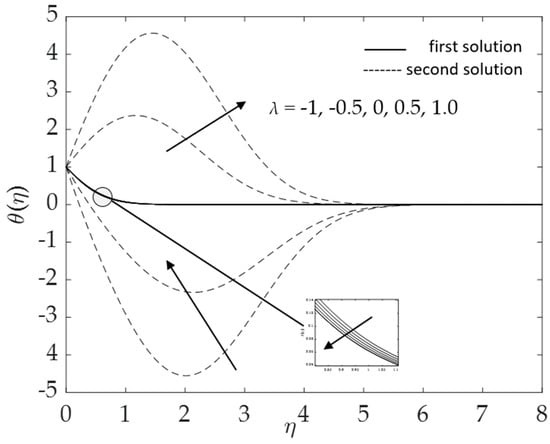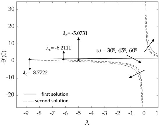Figure 18 and Figure 19 show the influences of the buoyancy force on the velocity and temperature for numerous values of the mixed convection parameter λ when ω = 30°, Pr = 6.2, K = 0.2, ϕ1 = ϕ2 = 0.01 and M = 0.1. In Figure 18, the velocity increases for the first solution, whereas the second solution shows the opposite trend with the increment of λ (opposing to assisting flow). Nevertheless, the temperature for the first solution decreases when the mixed convection parameter increases, as shown in Figure 19. The second solution presents inconsistent behavior in the temperature profile.