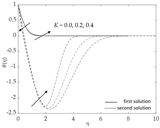 Figure 2 and Figure 3, respectively, show the effects of the curvature parameter K on the skin friction coefficient and the local Nusselt number (heat transfer rate at the surface). The figures illustrate that when the curvature parameter K increases from K = 0 (the surface of the cylinder behaves as a flat surface) to cylinders (K = 0.2, 0.4), both and increase for the first solution. This is due to the decrement in the radius of the cylinder and the increment of the fluid motions. Less contact between the fluid and the cylinder surface causes a reduction in resistance to the fluid flow. Moreover, increasing K will delay the boundary layer separation. Using cylindrical surfaces in boundary layer problems is one approach to obtain a high skin friction and a better heat transfer rate. However, the second solution demonstrates the contrary, with values that reduce as K rises. The second solution presented in Figure 3 produces the opposite results for both flow regions. The heat transfer rate increases for the phenomenon of buoyancy assisting flow (λ > 0); however, it decreases for the phenomenon of buoyancy opposing flow (λ < 0) due to the superior impacts of K.