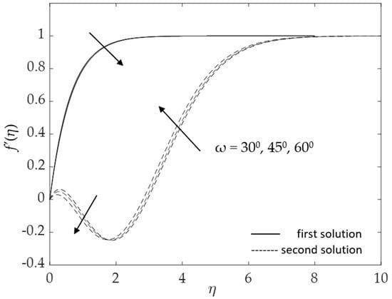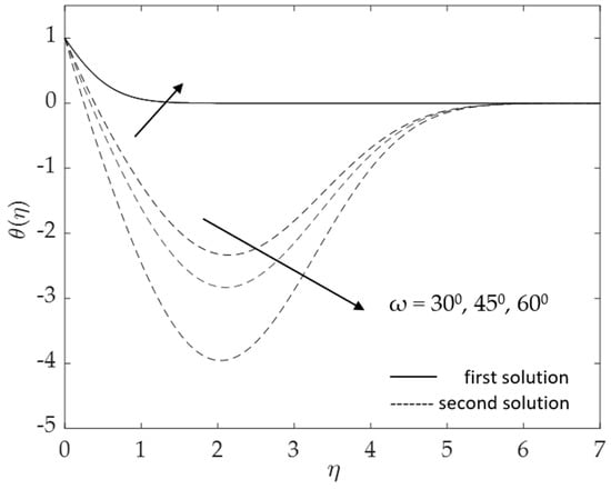 Further, the effects of the inclination angle ω on the profiles are depicted in Figure 12 and Figure 13. Physically, an increase in the inclination angle reduces the buoyancy effects, thus decreasing the velocity but enhancing the temperature in the boundary layers. The results in these figures correspond to the results shown in Figure 6 and Figure 7. As can be seen in Figure 12, when the inclination angle rises, the velocity decreases (for both solutions). However, the second solution augments when the boundary layer thickness is roughly greater than two. Meanwhile, Figure 13 shows a similar trend where the second solution displays the opposite behavior. We note that in the present study, there is a reduction to a vertical cylinder when ω = 0° and to a horizontal cylinder, when ω = 90°. The buoyancy effects for the latter case are very small and thus can be neglected.