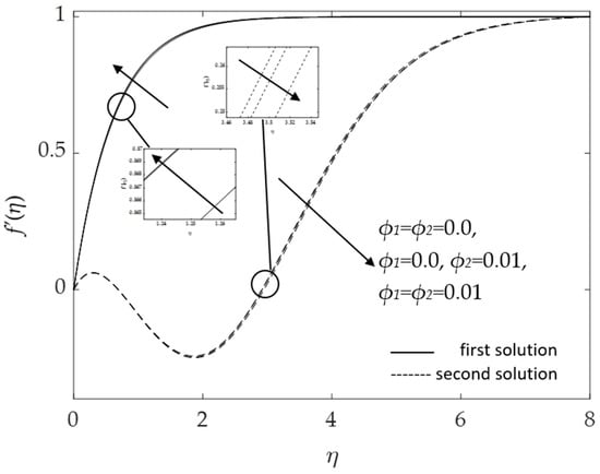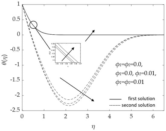 Figure 14 and Figure 15 portray the influences of the hybrid nanoparticle volume fraction ϕ1, ϕ2 for the base fluid (ϕ1 = ϕ2 = 0.0), Cu/H2O nanofluid (ϕ1 = 0.0, ϕ2 = 0.01) and Al2O3-Cu/H2O hybrid nanofluid (ϕ1 = ϕ2 = 0.01). It was found that the velocity elevates when the volume of the nanoparticles augments, as presented in Figure 14. The thickness of the momentum boundary layer reduces as the concentration of nanoparticles uplifts. Hence, the velocity of the fluid flow increases. Figure 15 shows that as the hybrid nanoparticle rises, the temperature curves and the thermal boundary layer thickness also upsurges. The surface heat flux lowers as the thermal boundary layer thickens. These discoveries are according with the results illustrated in Figure 4 and Figure 5. However, the second solutions for both figures show contradictory behavior, which is associated with the assisting flow (λ = 1).