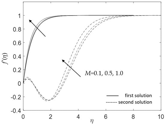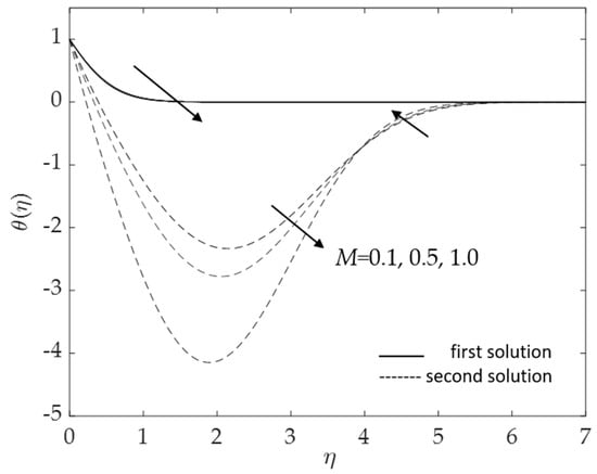 Apart from that, Figure 16 and Figure 17 present the effects of the magnetic parameter M on the velocity and temperature profiles when ω = 30°, Pr = 6.2, K = 0.2, ϕ1 = ϕ2 = 0.01 and λ = 1. By increasing the values of M, the velocity increases, as portrayed in Figure 16. The momentum boundary layer becomes thinner as the impact of M is boosted, causing an increase in the velocity gradient at the surface . Thus, the skin friction coefficient increases with increasing M for the present case. This result is consistent with that shown in Figure 8. Additionally, Figure 17 shows that the temperature distribution reduces as the magnetic parameter rises. Deceleration in the thermal boundary layer thickness leads to the increment of the heat flux. This shows a similar trend to that shown in Figure 15. This finding agrees with the illustration in Figure 9.