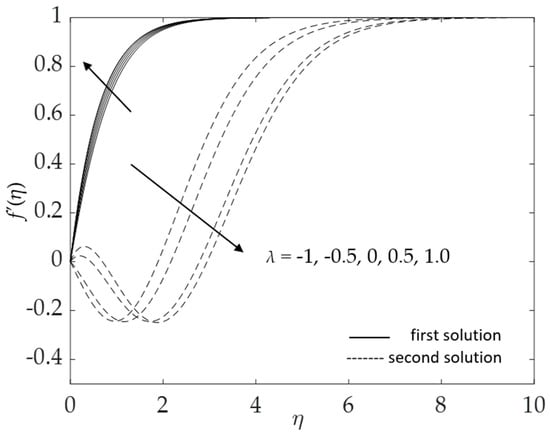 Figure 2, Figure 3, Figure 4, Figure 5, Figure 6, Figure 7, Figure 8 and Figure 9 represent the deviations of the drag forces or the skin friction coefficient and the heat transfer rate for λ < 0 (opposing flow) and λ > 0 (assisting flows) with mixed convection parameter λ for several values of the non-dimensional parameters. Dual solutions are possible for both assisting and opposing flows, as shown in the figures, but the solution is unique for the case of forced convection flow (λ = 0). Two solutions exist in the range λ > λc, and a unique solution is seen at λ = λc, but there is no solution when λ < λc. Here, λc denotes the bifurcation point or the critical value of λ for which the solutions are in existence. This critical value λc is a unique value where the first solution meets the second solution, after which the boundary layer separates from the surface, and no solution is found using the boundary layer approximations.