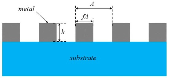 Various factors must be considered when designing the metal grating [] to achieve the desired optical properties and fabrication feasibility. As depicted in Figure 1, h represents the height of the gratings, and Λ denotes the period of the gratings, which influence the spatial and spectral resolution of the gratings. The grating height should be selected considering manufacturing feasibility and performance requirements. A larger grating height will increase manufacturing difficulty, while a smaller grating height will reduce the grating’s performance. The f is the duty cycle. It was found in [] that when f is about 0.5, the grating has good performance. Hence, the f is set to 0.5. Aluminum was selected as the material due to its alignment with the specified criteria for grating polarization performance. Then, through software simulation, the transmittance and extinction ratio of the grating can be obtained.