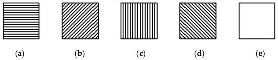 Grating units at different angles in the MPA: (a) 0° grating unit, (b) 45° grating unit, (c) 90° grating unit, (d) 135° grating unit, and (e) full-pass filter, which passes all states of light equally.