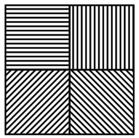 Traditional MPA consists of periodic superpixel units, each of which is composed of metal grating units with orientation angles of θ = {0,45,90,135}° []. Figure 2 illustrates the metal grating elements at different angles in the MPA. These grating units are organized and combined into 2 × 2 superpixel units, as shown in Figure 3. These superpixel units are then periodically arranged to create a traditional MPA. The traditional MPA is widely used in infrared polarization-imaging systems. However, it faces a common issue: a high pixel crosstalk rate that negatively impacts image quality. This problem is primarily caused by the large polarization components on the MPA, the dense distribution of gratings, the minimal spacing between adjacent gratings, and the differing polarization intensity information they provide. These factors lead to crosstalk between pixel units and frequency aliasing, which results in a loss of detailed information and a decrease in image contrast [].