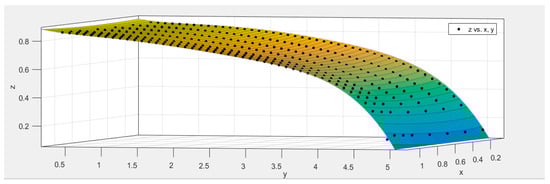 Subsequently, the data from these 517 groups of simulations were divided into two sets: the model training group (450 groups) and the model testing group (67 groups). Each group’s data included three parameters: grating height x, grating period y, and grating transmittance z. These three parameters were then fitted. This process yielded a fitting surface and a polynomial related to the three parameters. In this paper, polynomial functions were chosen for fitting, with the highest order of fitting set to 5. Equation (5) represents the polynomial formula after fitting, which served as the metal grating design function. Table 1 contains the polynomial coefficients, and the fitted function is displayed in Figure 7, where the change in color represents the change in height (that is, the value of the z-axis).