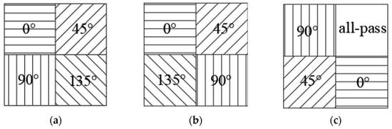 This paper mainly optimized the design of the traditional MPA and the MPA with an all-pass filter. Therefore, the input superpixel unit coding combination is mainly divided into two groups. The first group is the superpixel unit coding combination of the traditional MPA, involving the combination of four grating units with different angles, as shown in Figure 2a–d. There are a total of 24 coding combinations in this category. The second group is comprised of coding involving full-pass filters, where any three grating units from (a) to (d) in Figure 2 were arranged and combined with full-pass filters. This category includes a total of 96 coding combinations. It should be noted that the traditional four-direction MPA was designed separately from the MPA containing the full-pass filter. The traditional four-direction MPA and the MPA with the full-pass filter in step 2 of Figure 4 are only used as examples of pixel extraction and were not performed simultaneously.