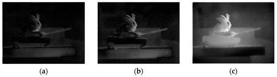 S1: Perform equivalent transformation on the source images according to the input transmittance (75%). Figure 4a–e shows the source images acquired through the time-sharing polarization-imaging system. The source image was equivalently transformed according to the input transmittance. The principle of the equivalent transformation is represented as: