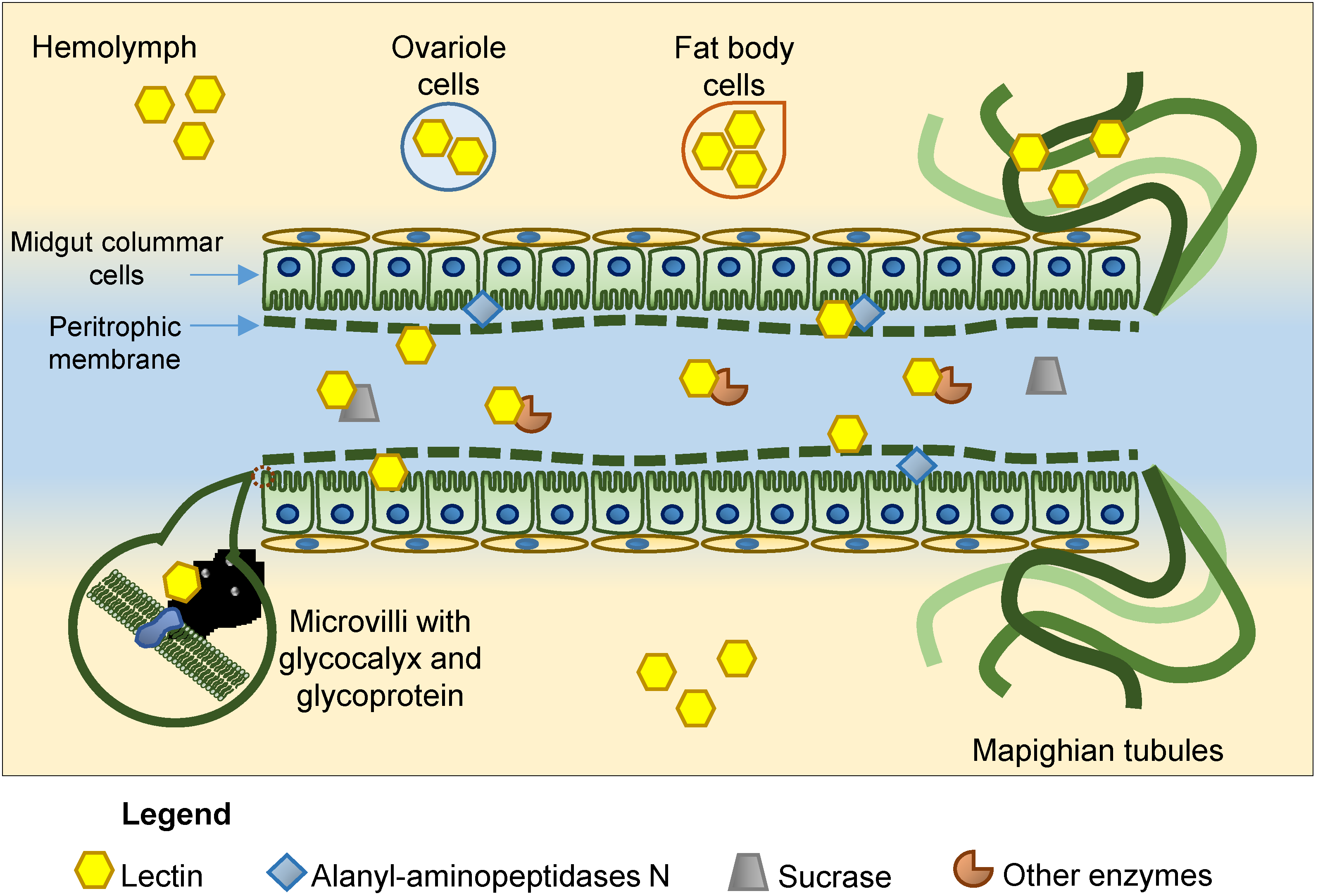 Another possible target site for lectins in the gut region is the peritrophic membrane (PM), since this membrane is mainly composed of chitin-microfibrils and glycoproteins [63]. In contrast, hemipterans do not have a PM. In the case of lepidopterans, a lectin-containing diet can cause deformations in PM formation and disruption of the microvilli. When the European corn borer (Ostrinia nubilalis) was fed on a wheat germ agglutinin (WGA)-containing diet, larvae presented hypersecretion of unorganized PM in the anterior midgut as well as disintegration of microvilli, indicating the binding of WGA to the chitin microfibers and several glycosylated matrix proteins [64]. The interaction of WGA may cause voids in the PM, allowing the passage of food particles through the PM and penetration into the microvillar brush border. On the other hand, the same was not observed for M. sexta, which presents differences in PM formation and structure, suggesting that these characteristics affect the interaction of WGA with chitin and other components of the PM [65]. WGA also causes abnormalities in the microvilli of Drosophila melanogaster [62]. Another example is Dioscorea batatas agglutinin (DB1), classified as a mannose-binding lectin, which strongly binds to the Helicoverpa armigera larvae brush border and the peritrophic membrane [66].