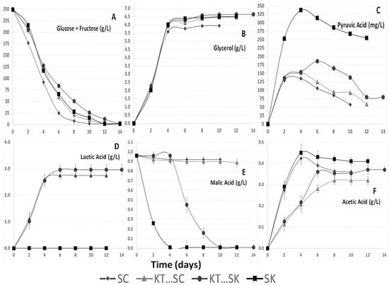(A) Glucose + fructose concentrations (g/L); (B) Glycerol concentrations (g/L); (C) Pyruvic acid (mg/L); (D) l-Lactic acid concentrations (g/L); (E) l-Malic acid concentrations (g/L); (F) Acetic acid concentrations (g/L). Parameters of the studied wines based on Tempranillo variety during fermentations performed by Saccharomyces cerevisiae 87 by itself (SC), sequential fermentation with Saccharomyces cerevisiae 87 and Kluyveromyces thermotolerans CONCERTO™ (KT···SC), sequential fermentation with Schizosaccharomyces pombe V2 and Kluyveromyces thermotolerans CONCERTO™ (KT…SK), and Schizosaccharomyces pombe V2 by itself (SK).