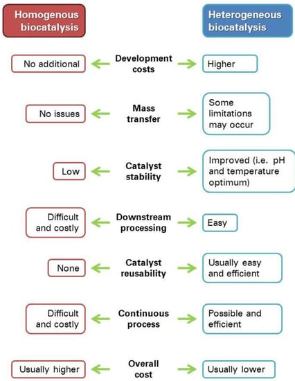Besides, soluble enzymes can be used for continuous industrial processes only under quite complex and expensive conditions (i.e., using membrane reactors), whereas their heterogenized counterparts are the ideal choices for large scale continuous processes []. The overall differences between homogenous and heterogeneous enzymatic catalysis are encompassed in Figure 1.