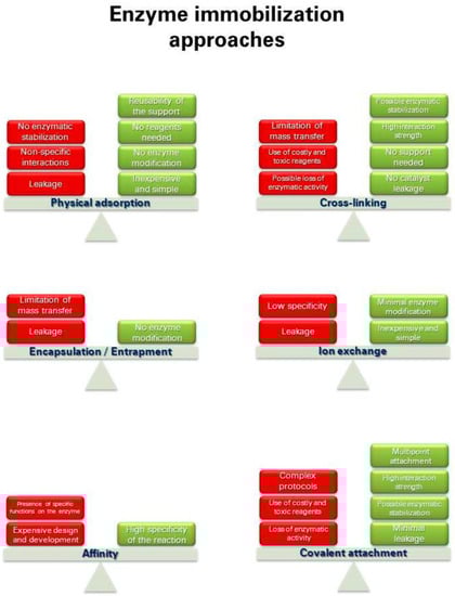 The first enzymatic immobilization was described in 1916, when Nelson and Griffin physically adsorbed invertase (E.C. 3.2.1.26) on charcoal []. Since then, in more than a century, several different approaches have been developed. Their main benefit and limitations are schematically reported in Figure 2.