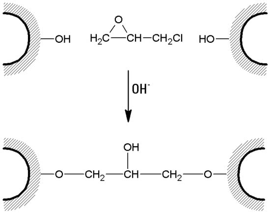 - A typical cross-linking procedure (Figure 4) involves the suspension of 1 L of swollen agar/agarose gel with 1 L NaOH 1 M, containing 100 mL epichlorohydrin and 5 g NaBH4. After 2 h of gentle stirring at 60 °C, the suspension is washed with hot water to neutrality, and re-suspended in 500 mL NaOH 2 M, containing 2.5 g NaBH4. The suspension is then treated at 120 °C for 1 h. Several washings are then performed, including 1.5 L of hot NaOH 1 M and 0.5% NaBH4, and 1.5 L of cold NaOH 1 M and 0.5% NaBH4. Then the suspension is cooled with ice and neutralized until pH 4 with CH3COOH []. The suspension can be stored in 0.02% sodium azide solution.