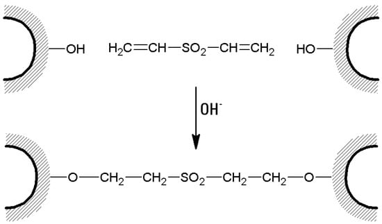 Provided that cross-linking treatments could often be carried on in the presence of water, beaded agarose gel particles (readily obtained by cooling biphasic systems under controlled temperature and stirring conditions) are simply reacted with the cross-linking agent under proper experimental conditions, directly affording the desired product. Several bifunctional agents are well known as cross linkers for agarose beads: among these, epichlorohydrin [], 2,3-dibromopropanol [], divinyl sulfone [,], bis-oxiranes []. The common feature of the crosslinking reactions is that they afford very rigid networks, without affecting the porosity of the gels. This depends on the cross-linking reactions taking place within the polysaccharide bundles that are reinforced with respect to their not cross-linked counterparts. The effect can be further enhanced in the presence of kosmotropic salts that promote water expulsion from the bundles, rendering them more prone to cross-linking. Anyway, the choice of proper experimental conditions allows obtaining products that are at the same time cross-linked and functionalized, provided that a fraction of the bifunctional agent reacts only by using only one end, whereas the other remains active and potentially ready to react with proteins or with other molecules.
