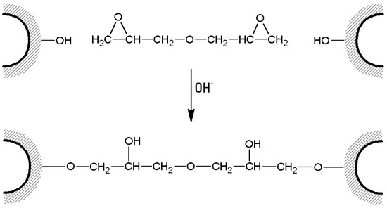 - In the case of bis-oxiranes, 1 g of dried agarose reacts for 8 h at 25 °C with 1 mL of a proper cross-linker (i.e., diglycidyl ether) and 1 mL of NaOH 0.6 M (containing 0.2% w/v NaBH4) [], as shown in Figure 7). Deactivation of unreacted oxirane groups can be performed by treatment of the gel with 2 M glycine or ethanolamine at pH > 8.5, 23 °C for 24 h.