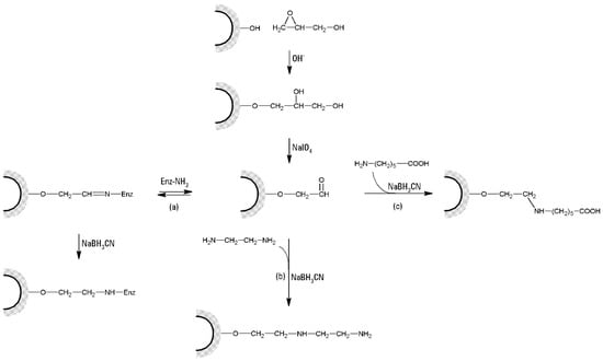 Glyoxyl agarose [] has been described for a long time as a very suitable tool to get a very strong enzyme-support multipoint covalent attachment. The support is prepared by etherification of the primary hydroxyl groups of the support with glycidol to introduce diols, that are later oxidized with sodium periodate to get the glyoxyl group [], as shown in Figure 8, path (a).