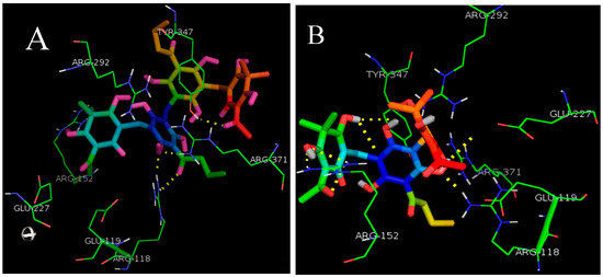 It has been reported that there was a ‘150-cavity’ adjacent to the active site of NA (PDB ID: 3CL0, H5N1), which was proven as an anti-influenza drug target to develop new NA inhibitors [22]. The binding modes of ten phloroglucinols with NA showed that trimeric and tetrameric phloroglucinols filixic acid ABA, ABB, and dryocrassin ABBA could dock into both the active site and the ‘150-cavity’ of NA. The other seven monomeric or dimeric phloroglucinols could only dock into the active site (Figure 2A,B). Moreover, filixic acid ABA, ABB, and dryocrassin ABBA formed several hydrogen bonds and hydrophobic interactions with the key residues Arg118, Arg152, Arg292, Arg371, Glu119, and Glu227 in the active site and ‘150-cavity’ (Figure 3A–C). Therefore, filixic acid ABA, filixic acid ABB, and dryocrassin ABBA may have the potential to inhibit NA of the H5N1 virus.