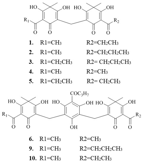 - Widen, C.J.; Pyysalo, H.; Salovaara, P. Separation of naturally occurring acylphloroglucinols by high performance liquid chromatography. J. Chromatogr. 1980, 188, 213. [Google Scholar] [CrossRef]