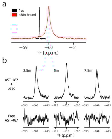 Supplementary materials are available online. Figure S1: ATS-487 concentration-dependent spectral changes of p38α, Figure S2: Estimation of the applicable mixing delays for CF3–FCT analyses of the ATS-487-p38α complex, and Figure S3: The effect of receptor protonation on the 19F linewidth and the FCT build up.