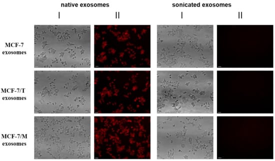 Transferring of fluorescent-labeled compounds by exosomes. Exosomes were stained by fluorescent drug (CellTracker™ Red CMPTX Dye) in according to the manufacturer’s procedure, then washed twice by the ultracentrifugation 100,000× g and incubated with MCF-7 cells. As a control labeled exosomes after sonication were used. The non-specific labeling of cell was checked by the fluorescent dye which was spun alone. The efficiency of dyeing exosome incorporation was checked with fluorescent microscope Nikon Eclipse Ti-E (Plan 10×/0.25; ORCA-ER camera by Hamamatsu Photonics; NIS-Elements AR 2.3 software by Nikon). Exposition for fluorescence was 4 s. Scale bar 50 µm. The images of light (I) and fluorescent (II) microscopy are presented.