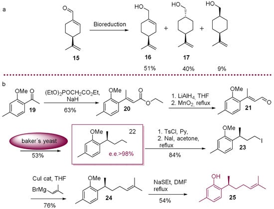 As an example of the application of biocatalyzed chiral reduction reactions for the synthesis of complex substances, Serra and coworkers [] reported the enantioselective synthesis of several phenolic bisabolane sesquiterpenes based on the decagram scale BY-mediated reduction of the corresponding aldehydes to afford important intermediate alcohols 22, 29 and 34, which are useful building blocks for the synthesis of phenolic sesquiterpenes with the (S) absolute configuration, 25, 30 and 37, respectively. These sesquiterpenes of the bisabolane family show a wide range of biological properties, such as antibacterial and antitumor activities. The authors achieved the synthesis of the aldehydes using a common pathway from the related esters through reduction and subsequent allylic oxidation; the esters in turn were synthesized from the corresponding acetophenones via a Horner-Wadsworth-Emmons reaction. The results of the biotransformation showed a conversion of the aldehydes into the saturated alcohols (49–56% yield as isolated products) after only 4–6 days of incubation, with e.e. values of greater than 98%. These results correlated with the findings reported by the same group [,], who previously published studies on the regioselective bioreduction of the conjugated double bond of (S)-perillaldehyde (15), finding that Euglena gracilis- and baker´s yeast-mediated biotransformation of this compound produced a mixture of unsaturated and saturated alcohols 16–18 (see Scheme 7a).