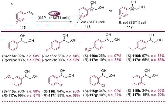 One of the best applications of biocatalysis is the preparation of enantiopure vicinal diols, compounds that are useful and valuable synthetic intermediates for many bioactive compounds, pharmaceuticals and chiral reagents. Asymmetric cis-dihydroxylation of olefins can be achieved in one step by Sharpless dihydroxylation using a heavy metal oxide catalyst with chiral ligands; on the other hand, chemical trans-dihydroxylation of olefins requires two reaction steps: epoxidation and the subsequent epoxide hydrolysis. This strategy has been used to purify unstable intermediates and uses toxic metals (Os or Co, among others). Thus, one-pot cascade biocatalysis for this transformation offers a greener and perhaps more efficient approach for the preparation of vicinal trans-diols. The approach is also a complementary tool to Sharpless dihydroxylation. Using this strategy, Li and coworkers [] reported the development of E. coli (SSP1) cells coexpressing a styrene monooxygenase and an epoxide hydrolase as a simple and efficient biocatalyst for the (S)-enantioselective dihydroxylation of several terminal aryl olefins 115 to produce the corresponding (S)-vicinal diols 116 with a high e.e. and good yield. Additionally, the development of E. coli (SST1) cells co-expressing the same styrene monooxygenase and another epoxide hydrolase with the complementary regioselectivity has been reported as an efficient and simple biocatalyst for the preparation of the corresponding (R)-vicinal diols 117 with good yield and a high e.e.