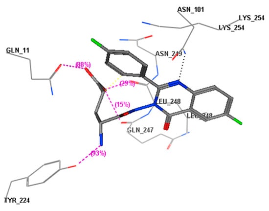 Title compound (E) was able to occupy the EGFR binding site in the same way, through formation of hydrogen bonds with Met769 (distance 3.04 Å) and the oxygen atom in (C=O) at position 4 of the quinazolinone moiety. Furthermore, there were two extra hydrogen bonds which made the ligand binding strength better than that of erlotinib. The first extra hydrogen bond was between the (OH) of the (COOH) group and the amino acid residue Asp831 (distance 1.2 Å). The second extra hydrogen bond was between the free oxygen atom of the (COOH) group and Lys721 (distance 2.3 Å). In addition, there were some hydrophobic interactions associated with the two aromatic rings and the two fluoride atoms. These interactions produced a better energy score (−23.5 Kcal/mol) for compound E than that of erlotinib (−13.5 Kcal/mol). Figure 7 shows the molecular interactions of compound E with the EGFR binding site.