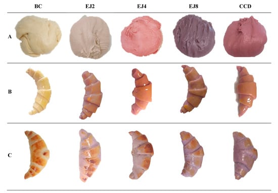 Appearance of different croissant formulations. (A) after second fermentation of batter; (B) before baking; (C) after baking. BC: croissant with no colorants adding; EJ2: croissant with 2% of elderberry juice (EJ2); EJ4: croissant with 4% of elderberry juice; EJ8: croissant with 8% of elderberry juice; CCD: croissant with 4% of the commercial carrot dye.