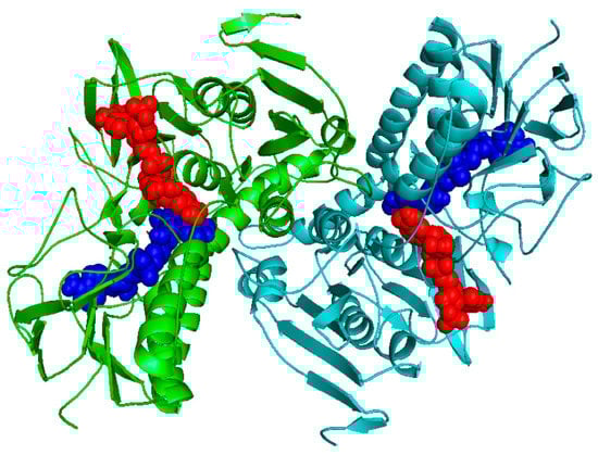 3D model of the LmTR built with the SWISS-MODEL server. The two subunits are colored in green and cyan. The FAD and NADPH are indicated using blue and red spheres, respectively. The picture was generated in PyMol [].