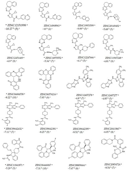 The ZINC codes of the 20 structures and their estimated docking scores are listed in Figure 3. Compounds ZINC04684558, ZINC09642432, ZINC12151998, ZINC14970552, and ZINC11841871 were selected based on a broad range of docking scores (from −10.27 kcal/mol to −5.29 kcal/mol), as well as their structural diversity, to evaluate their in vitro inhibition of rLmTR activity and leishmanicidal activity. In addition, they were also selected considering their commercial availability.
