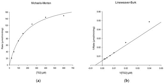 The Km value of rLmTR was determined at 150 µM NADPH and different concentrations of T[S]2 (20, 50, 100, 150, 250, 400, and 600 µM). The kinetic data were analyzed by linear regression fit to Michaelis–Menten kinetics and linearized by the double reciprocal transformation of Lineweaver and Burk [].
