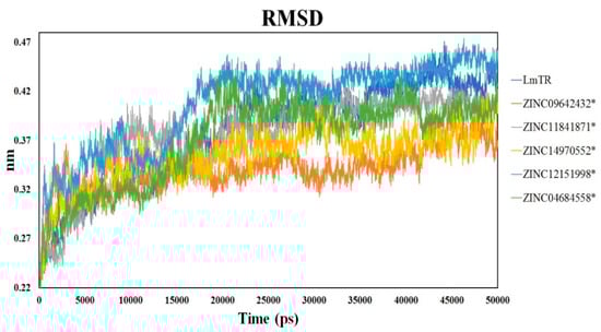 Root-mean-square deviation (RMSD) of LmTR and LmTR–inhibitor complexes. * denotes significant differences with respect to LmTR (p < 0.05). Statistical analysis was performed by applying ANOVA testing.