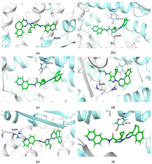 The hydrogen bonding interactions of compound ZINC12151998 with LmTR protein throughout the molecular dynamics study are presented in Figure 7. (a) At 10 ns, a first interaction between the N of the quinoline nucleus and Gly459 at monomer B in Active Site 1 was achieved. (b) At 20 ns, interactions between the NH of the amide group and Glu467 at monomer A and the carbonyl group of the amide with the OH of Tyr110 at monomer B in Active Site 2 were observed. (c) At 30 ns, the interaction between the carbonyl group of the amide with de OH of Tyr110 at monomer B in Active Site 2 still remained. (d) At 40 ns, three main interactions were observed: the first one between the carbonyl group of the amide and the OH of Tyr110 at monomer B; the second one between the NH of the amide group and Glu466 at monomer A; and the third one a double interaction between Hist461 at monomer A and the N of pyrazole and the N of the pyrimidine nuclei, all of them in Active Site 2. (e, f) At 50 ns, two main interactions were observed: the N of the quinoline nucleus with Arg355 at monomer A in Active Site 1 and, once again, the carbonyl of the amide group with Tyr110 at monomer B in Active Site 2.