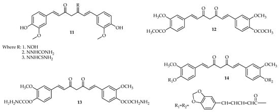 Agrawal and Mishra synthesized new curcumin derivatives, in these compounds; derivative (11) exhibited significant antioxidant activity. These curcumin derivatives were also evaluated for antiproliferative effects against MCF-7 estrogenic-dependent breast cancer cell line when compared to curcumin alone with 64% cell viability. The result revealed curcumin derivative as an effective antiproliferative agent with 26% cell viability []. Compound 13 and 14 displayed increased activity which indicates that these curcumin derivatives may be effective and may have the ability to overcome the bioavailability problem that is faced by free curcumin (Scheme 3). The curcumin derivatives 15 and 16 displayedsignificant anticancer action when compared to curcumin alone in various ER+ and ER− human breast cancer cells. The IC50 values of 15 and 16 ranged from 0.3 to 5.7 µM, respectively, which is lower than the IC50 values of curcumin (1–7.5 µM) cell lines. Compound 15 and 16 inhibited Akt, STAT3, and HER2/ Neu pathways and induced apoptosis at the concentration of 10 µM []. These compounds were also active when combined with doxorubicin as they showed a synergistic antiproliferative effect in MDA-MB-231 with the IC50 value of 2.8 and 2.7 µM, respectively, on breast cancer cell lines. Moreover, these compounds inhibited anchorage-independent advance and cell migration in MDA-MB-231 cells (Table 3) []. Compound 15 was found to be cytotoxic toward ER-breast cancer cells with the IC50 value of 5.0 μM and exhibited antiangiogenic effects in human and murine endothelial cell lines [,].