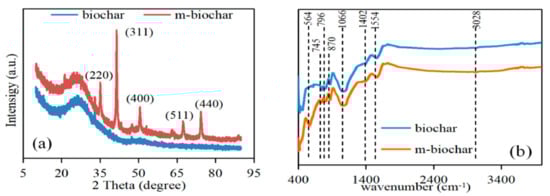XRD analysis was conducted in order to identify the compositions of the reed-derived biochar before and after the magnetic modification. The XRD pattern of m-biochar is identical to magnetite (Figure 1a). The representative diffraction peaks at the positions of 35.2°, 41.5°, 50.6°, 67.4° and 74.4° matched well with the standard PDF card of Fe3O4 (PDF#75-1610). Such diffraction peaks were also quantified by the previous study of synthesised magnetic biochar by zero-valent iron through co-pyrolysis method []. The results confirmed that Fe3O4 was successfully doped onto the biochar material.